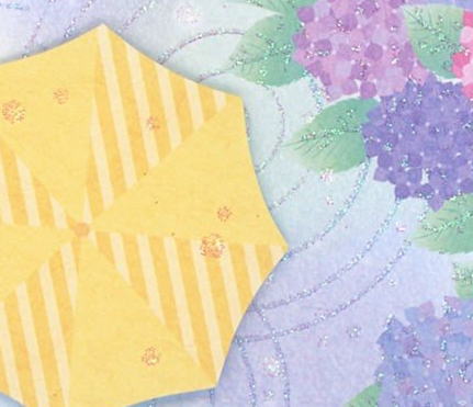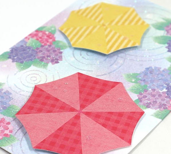 ■仕様:立体カード■加工:ラメ加工、浮かせ貼り加工 初夏、梅雨時期の季節に向けた2つ折り多目的カードです。